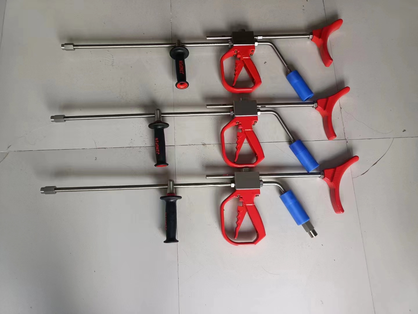 The high-pressure pump generates a high-pressure water jet when in operation. Connect the pipe unclogging nozzle to the high-pressure pump through a high-pressure hose, and place the nozzle directly in the pipe that needs to be unclogged. When the high-pressure pump is working, the reaction force generated by the high-pressure water sprayed from the rear of the nozzle is used to push the nozzle forward quickly, and the high-pressure water jet generated by the front and rear spray holes of the nozzle is used to quickly clean the pipe. When the pipe collector pulls the nozzle back, the high-pressure water flow will flush the dirt out of the pipe bundle.